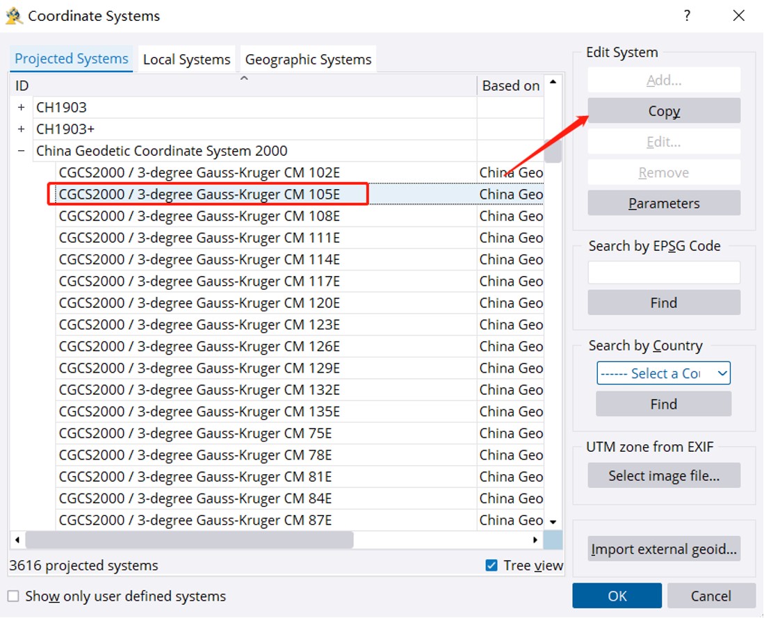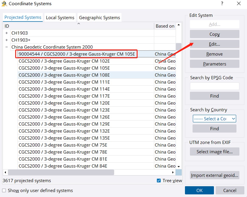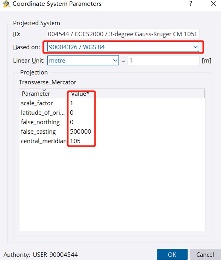 选择椭球基于刚刚复制修改的椭球。这里也可以修改中央经线以及东偏量,按照项目要求填写。