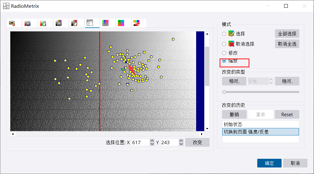 用缩放工具,拉框进行缩放,然后就能看到一个蓝色的点,这个点就是代表参考片。黄色点是需要调色的影像。绿色点是所有影像的色彩均值。