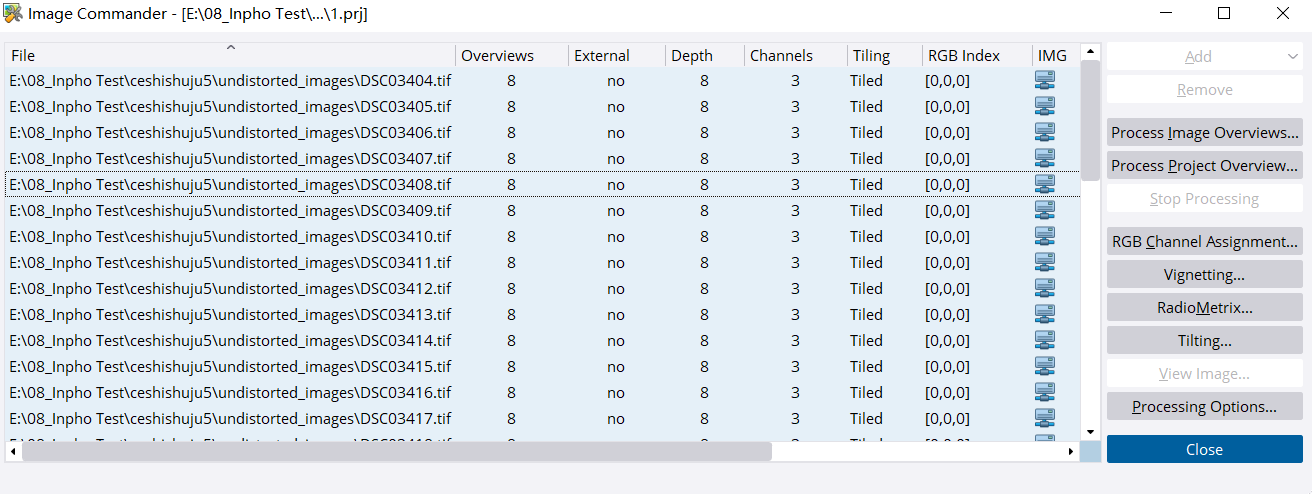由于Inpho中相机畸变参数的定义与Pix4Dmapper中不同,并且这些定义之间的转换是未知的,为了将畸变参数设置为0,必须使用无畸变影像。