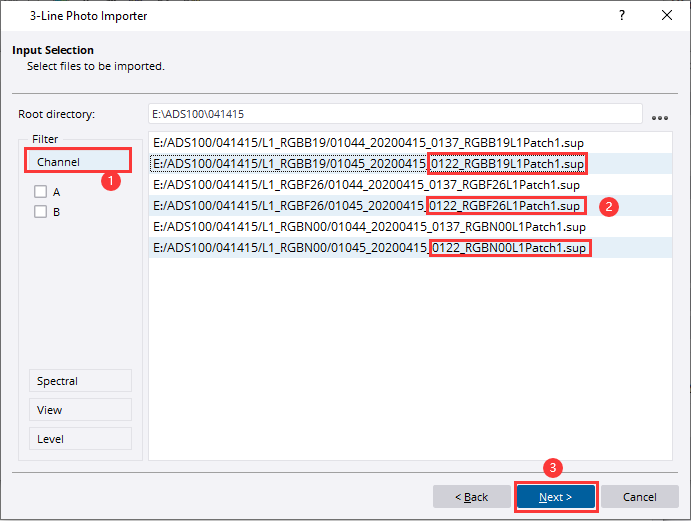 (5) 在导入影像数据文件后,选择“Channel”,选择来自同一测站的前视(RGBF)、下视(RGBN)、后视(RGBB)构建三线阵立体像对,并设置导入影像文件的名称完成所选择的三线阵立体像对的导入。